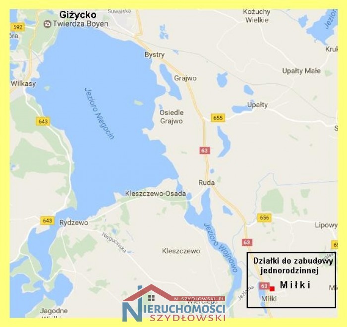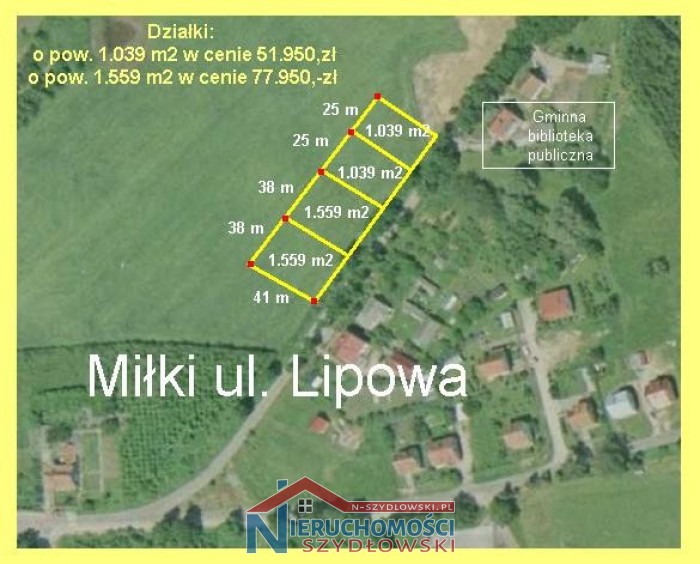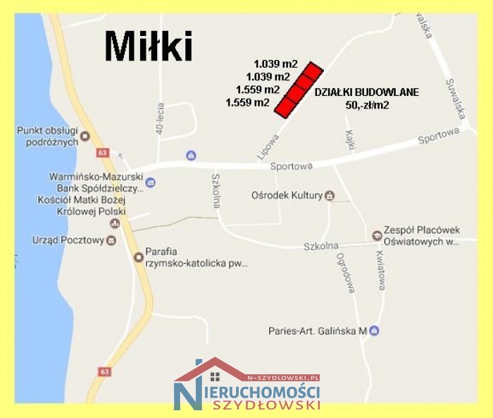 Działki do zabudowy jednorodzinnej o powierzchni 1.039 m2 (25 m x 41 m) oraz o powierzchni 1.559 m2 (38 m x 41 m). Teren lekko pofałdowany. Działki bezpośrednio przy nowo wykonanym chodniku i drodze asfaltowej. Wodociąg, kanalizacja i energia elektryczna w ulicy (po drugiej stronie drogi). Giżycko 12 km. Miejsce bardzo fajne, spokojne, a w najbliższym sąsiedztwie zabudowa jednorodzinna. Cena atrakcyjna, działki o pow. 1.039 m2 po 62.340,-zł, a o pow. 1.559 m2 po 93.540,-zł. Polecamy.