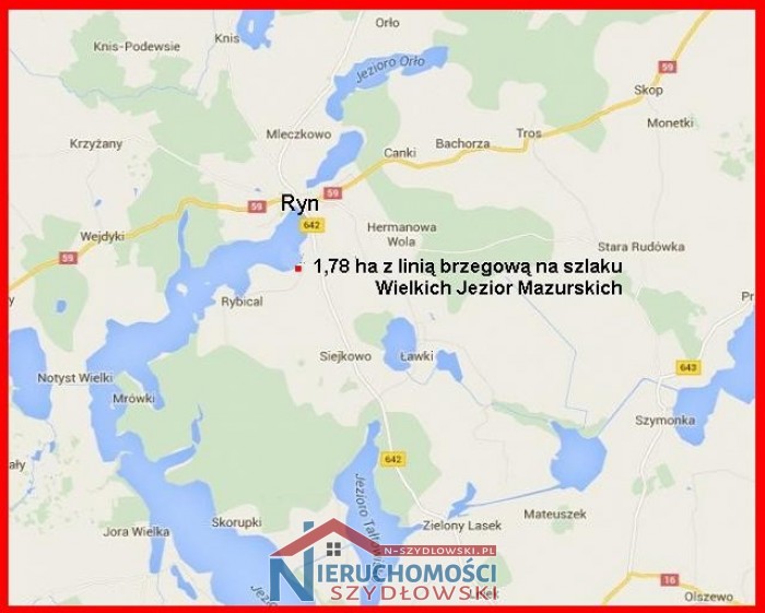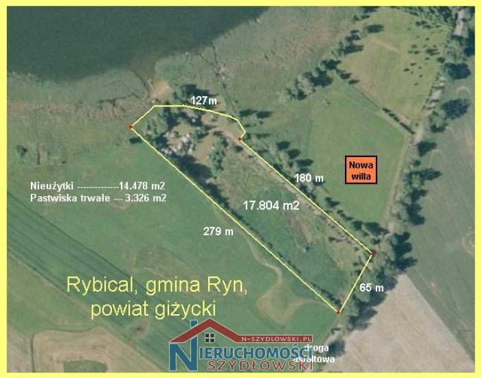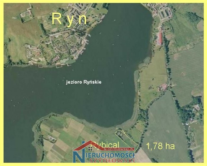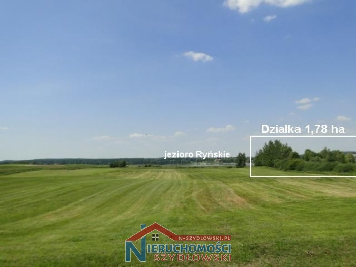 Działka o pow. 1,7804 ha - grunty rolne, w tym pastwiska trwałe [PsIV] o pow. 0,3326 ha i nieużytki [N] o pow. 1,4478 ha. Nieruchomość położona między brzegiem jeziora Ryńskie (po łuku ok. 125 m), a drogą powiatową (ok. 65 m). Teren płaski, ogrodzony drewnianym płotem. W centralnej części staw. Możliwość uzyskania warunków zabudowy z uwagi na tzw. dobre sąsiedztwo (na sąsiedniej działce wzniesiono willę). Media na działce: energia elektryczna, woda ze studni z hydroforem, szambo. Media przy drodze: wodociąg i kanalizacja.